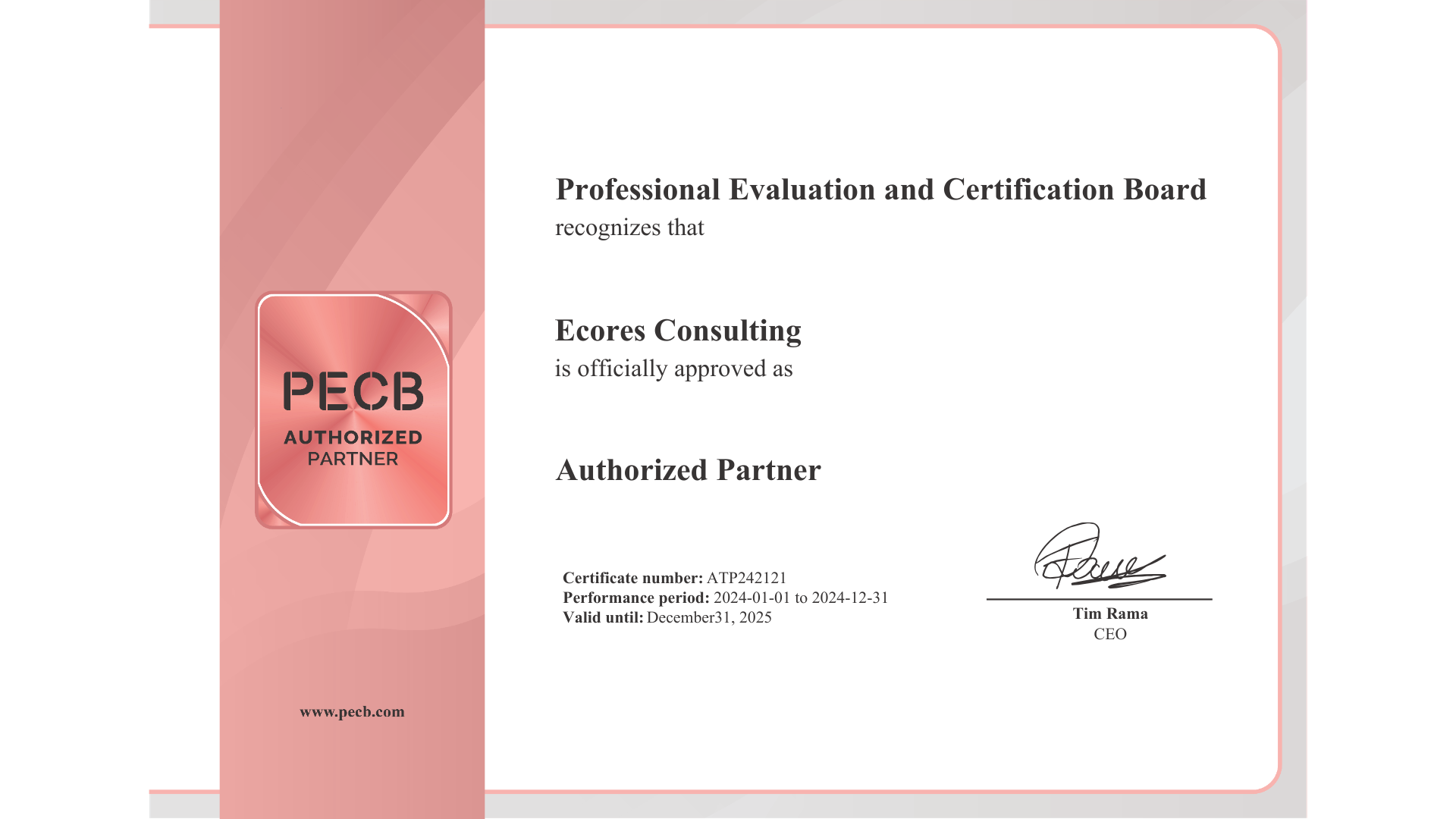 11 septembre 2025 – PECB a le plaisir d’annoncer l’établissement d’un partenariat mutuellement bénéfique avec Ecores Consulting portant sur l’offre de formations en Tunisie. Ce partenariat combine les services professionnels de PECB et les capacités de Ecores Consulting à offrir des cours de formation avec compétence, des résultats satisfaisants et une expérience exceptionnelle.